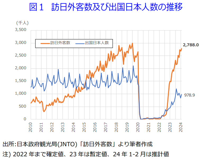 ▶JNTO 訪日外客統計によれば(図 1)、2 月の訪日外客総数(推計値)は 278 万 8,000 人であった。春節休暇やうるう年で日数が増加した影響もあり、単月過去最高を更新。2019 年同月比では+7.1%と 2 カ月ぶりに増加した。なお、中国人客を除いた総数は 232 万 8,600 人で、同+23.8%と 8 カ月連続のプラス(前月:同+17.4%)。また、同月の出国日本人数は 97 万 8,900人となった(前月:83 万 8,581 人)。19 年同月比-36.2%と前月(同-42.3%)から減少幅は縮小した。