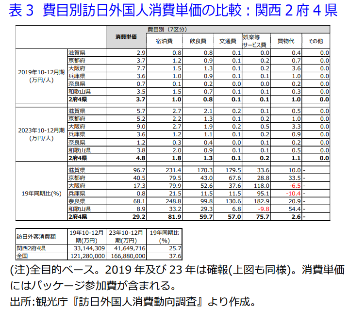 - 2023年10-12月期の関西2府4県の訪日外国人消費単価(旅行者1人1回当たりの旅行消費金額)は19年同期比+29.2%増加。費目別では、飲宿泊費や娯楽等サービス費が大幅増加した。