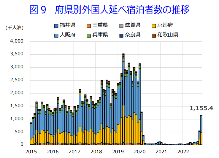 ▶外国人延べ宿泊者数は 1,155.4 千人泊と前月(555.9 千人泊)から倍増した。2019 年同月比-59.3%と減少幅は前月(同+81.5%)から大幅縮小(表 1 及び図 9)。府県別に延べ宿泊者数を降順にみれば、大阪府 596.9 千人泊、京都府 476.0 千人泊、兵庫県 30.5 千人泊、和歌山県 18.4 千人泊、滋賀県 9.2 千人泊、奈良県 8.0 千人泊、三重県 7.5 千人泊、徳島県 4.4 千人泊、福井県 2.3 千人泊、鳥取県 2.3 千人泊であった。2019 年同月比でみると、京都府(同-56.4%)、大阪府(同-57.7%)を中心に回復している。京都府や大阪府は 5 割程度の回復となっているが、他府県では 2~3 割程度の回復にとどまっている。