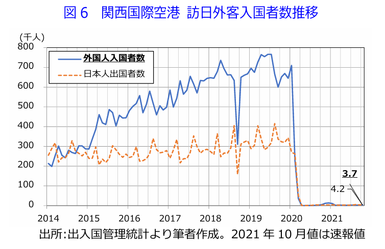 ▶10月の関西国際空港(以下、関空)への訪日外客数は3,743人と前月(3,079人)から増加した(前々年同月比-99.4%)(図6)。8月16日から行われている1日当たりの入国者数の上限が緩和された影響が表れているようである。なお、前述したように政府は原則停止していた外国人の新規入国をビジネス目的などに限って緩和策を行っているため、今後入国者は幾分増加が見込まれよう。また、同月の日本人出国者数は4,160人で前月(4,090人)から増加したが、伸びは前々年同月比-98.7%と大幅減少が続く。