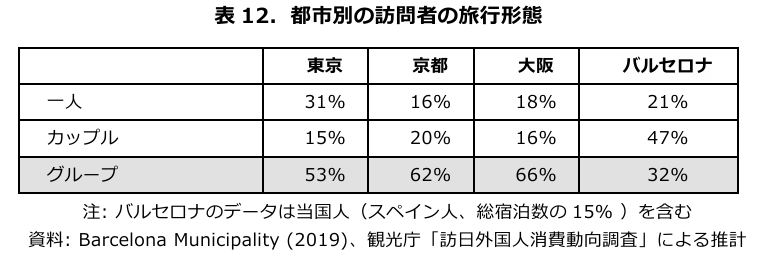 別の統計をみると、バルセロナの旅行者の3分の1が3人以上のグループで旅行するが、その割合は関西では3分の2とバルセロナの倍であることが確認できる(表12)。