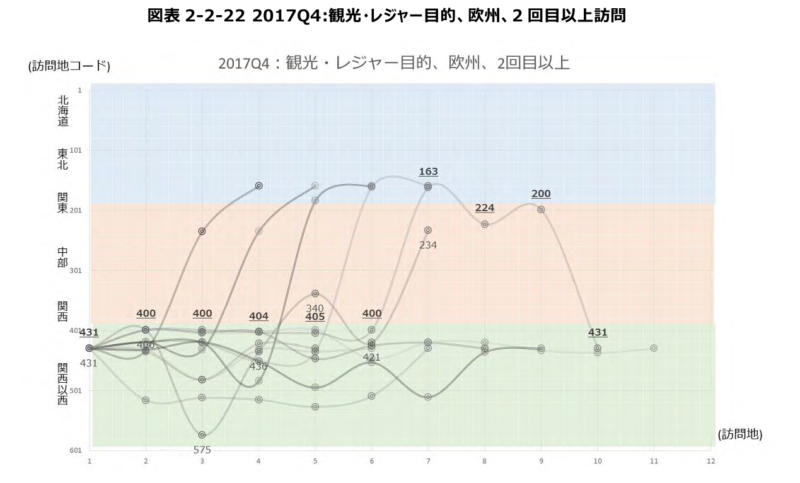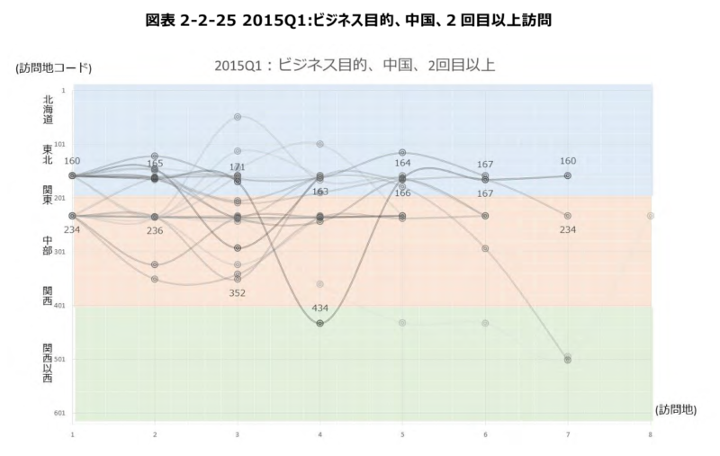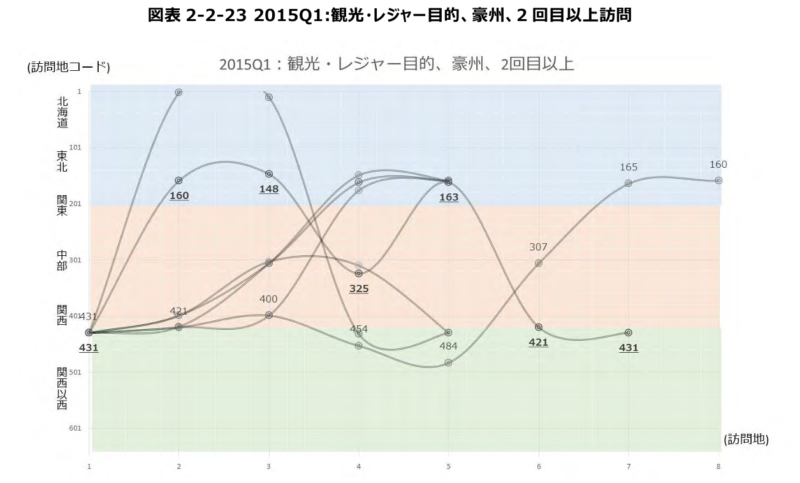 入国港にあたる第1訪問地には『431』と記されており、これは関空に入国してきたことを表す。そして、入港してから第2訪問地では『433』:大阪府へ、第3訪問地では『420』:京都府へ移動し関西にとどまっている。しかし、第4訪問地では中部地域である『294』:富士五湖内へ移動し、第5訪問地になると関東地域の『238』:箱根へ、第6訪問地では『165』:浅草を訪れ、最後に第7訪問地の『160』:成田空港で出国している。また、少ない例ではあるが、関空で入出国するケースも見られる。このケースでは関空へ入国後、第2訪問地『421』:大阪市へ移動し、第3訪問地『238』:箱根、第4訪問地:『350』:富士市などを周遊し、第5訪問地:『162』東京へ行ったのち、第6訪問地では第2訪問地目と同じ大阪市へ戻り、関空で出国している。その他にも、関空へ入国し中部国際空港または福岡空港で出国するパターンも見られるが、関空で入国し成田空港・羽田空港で出国するパターンが大勢を占めている。このように関西へ滞在したのち中部地区を経て、関東へ移動している人々が多くみられるが、これはゴールデンルート(関西地域から入国し関東地域へ出国する)が、2015年第1四半期においては代表的であることを示している。なお、後掲の図表では紙幅の都合もあり、2015年第1四半期と17年第4四半期に限定して移動パターンが比較されている。