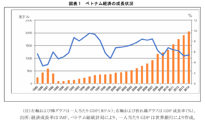 長期間にわたり大国との戦争を経験したベトナムにおいて、経済発展が始まったのは 1975年の南北統一以降である。また、1986 年にドイモイ政策が実施され、経済体制は計画経済から市場経済体制に、閉鎖経済から開放経済に移行した。ドイモイ政策の実施から約30年、ベトナム経済は著しい成果を遂げてきた。その成果は経済成長の面においても、国際経済への統合の面においてもよく見られる。