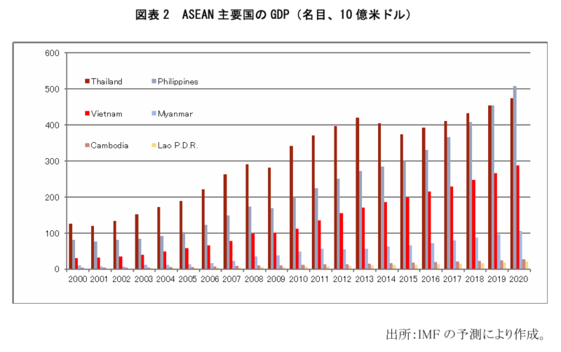 前述の通り、ドイモイ政策以降、ベトナム経済は大きな成果を上げているが、経済の規模自体は未だに小さい。例えば、ASEAN 諸国と比較すると、ベトナムの GDP はミャンマー、ラオス、カンボジアより大きいものの、高所得国のシンガポールやブルネイ、中上所得国のタイ、マレーシアはもちろん、同様の中低所得国のフィリピン、インドネシアほどは経済の規模が大きくない(図表 2)。また、国際通貨基金(IMF)の予測によると、2020 年に入っても、ASEAN の CLMV(カンボジア、ラオス、ミャンマー、ベトナム)から抜け出するのは難しいと予想される。このように、経済に大きな改善がなければ、著しい成長は遂げられないと思われる。