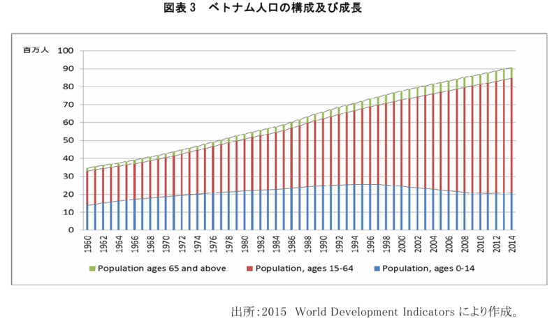 ベトナムには他の発展途上国と同様に、人口が多く、かつ出生率が高いといった特徴がある。ベトナムの人口、特に労働人口は安定的に増加している(図表 3)。2014 年の国際連合のデータによれば、ベトナムの人口はASEANで3位、世界で14位となっている。このような若年労働力は経済発展に非常に重要な貢献をしている。特に、海外からの資金を利用し、工業化・経済成長の戦略をとるベトナムにおいては、この豊富で安価な労働力は海外資本を誘致する武器となっている。さらに、近年、中国における人件費の高騰に伴い、新たな労働力の調達先としてベトナムが注目されている。例えば、日本投資家にとって、長期間にわたりベトナムが魅力的な投資先とされた理由は、中国、インドネシアなどのアジア諸国と比べ人件費が安いことと従業員の質が高いことである。