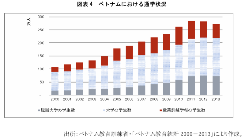 途上国にもかかわらず、ベトナムの識字率は 97%であり、世界の識字率の 86.3%と比べると、比較的高い。また、生活水準の向上とともに、教育水準も徐々に上昇してきた。ベトナムの平均就学年数の人間開発指数データを見ると、1980 年には 4.2 年間であったのに対して、2014 年には 7.5 年間に増加し、世界平均の 6.2 年間を上回っている。図表 4 でも確認できるように、毎年、職業訓練校、短期大学、大学への入学者も増加している。具体的には、2000 年から 2014 年まで、大学、職業訓練学校、短期大学への入学者数はそれぞれ 2 倍、3 倍、4 倍となった。進学の向上心は留学する学生の数にも反映されている。例えば、アメリカや日本に留学する学生も毎年増加し、2014 年には、アメリカへの留学生数は 18,722 人となり、出身国別留学生の8番目となった。日本への留学者数も著しく増加し、2014年には26,439人に上り、出身国別留学生の 2 番目となった。こうしたことから、ベトナムから他国に留学する学生は将来的にベトナムの優秀人材になると期待されている。