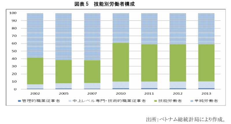 その他、ベトナム労働省『就業・労働力調査』(各年版)によれば、就業形態別人員としては、中上専門的職業従事者が2000年に5%であったのに対し、徐々に増加し2014年には9%となった。また、同じ期間に単純労働者が約 60%から 40%まで大幅に減少した。また、出稼ぎ労働力の中身をみれば、労働者の質が向上していることも観察されている。具体的には、2005 年に専門技能を持つ労働者は 15.4%であったが、2014年には約3倍の43%まで増加した。