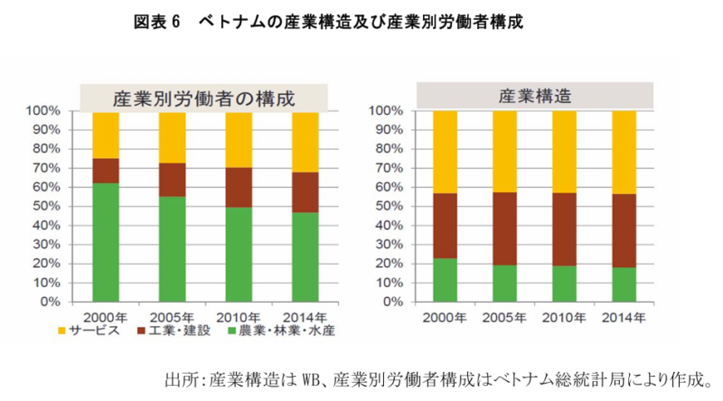 ベトナム政府は2011年~2020年までの経済・社会成長戦略において、2020年までにベトナムを近代的な工業国に成長させるという目標を設定した。また、経済分野において、経済構成の改善の決心を固めた。具体的には、工業・サービス業が GDP に占める割合を約 85%に、その内、ハイテク産業による寄与額をGDPの約45%まで拡大させる。同時に、農業産業における労働を社会全体の約3割に減少させると主張した。