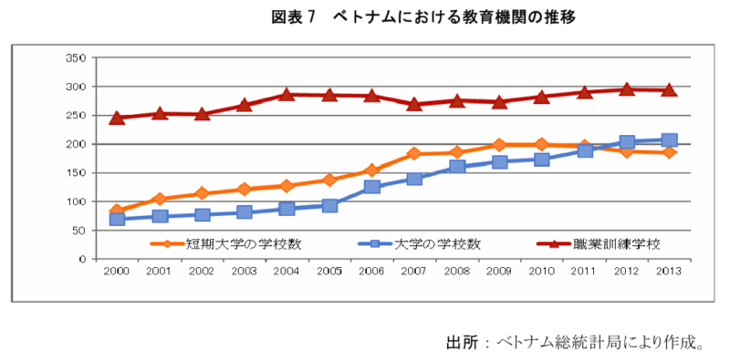 近年、ベトナムの通学状況(図表 4)は好調な成長を見せている。また、図表 7 に示す通り、教育機関、特に大学の数が急増してきた。短期大学は 2011 年から減少する傾向を見せているが、2000 年と比べると、2 倍ほど拡大した。また、職業訓練学校の増加率も徐々に伸びている。このように、学生数においても、学校数においても高等教育は拡大している。これらの訓練を受けた人材は工業、サービス業に活躍する労働者になるが、工業、サービス業による GDP への寄与度は期待ほど高くない。そこで、教育問題は労働者の能力向上のボトルネックではないかと考えられる。即ち、数量の面だけではなく、教育の質を改善することも重視しなければならない。