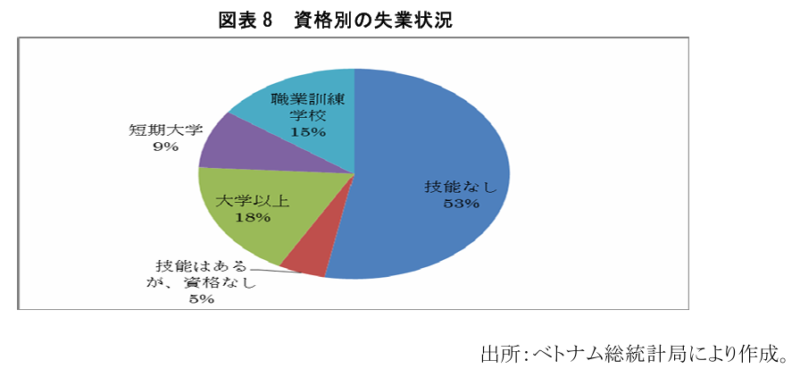 ベトナム教育はこれまで大きな発展を遂げてきたが、一般教育を中心に職業・技能を訓練する機関は未だ十分普及していない。しかもベトナム人にとって、実際の技能よりも資格が選好されるため、職業訓練学校は最後の道として選択されている。2015 年 6 月時点で、訓練を受けた労働者の内大学卒の労働者の割合は 41.5%でもっとも多く、短期大学卒の割合は 15%、中級職業訓練学校卒の割合は 27%、初級職業訓練学校卒の割合は 16.4%である。大学に通学する学生数が多いが、大学を卒業しても、仕事が見つからない現状となっている。図表 8 で示している通り、資格別の失業者数の統計を見ると、大学卒の割合がもっとも多いことが明らかである。おそらく大学における教育プログラムで身に着けることのできる能力と実際の仕事において要求される能力に大きな差が存在しているからだと思われる。この状況において、一般資格よりも、具体的な職業・技能の訓練を行うことは重要であると考えられる。