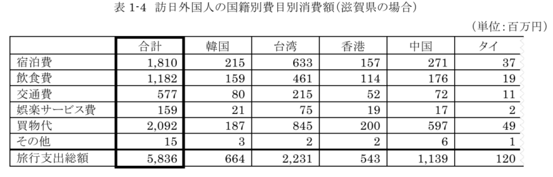 (1)で求めた国籍別・都道府県別訪日外国人数に(2)の購入者単価を乗じて、国籍別・都道府県別の消費金額を費目別に推計する。表1-4は、滋賀県での消費金額の推計結果を例示したものである。例えば韓国の宿泊費は、購入者単価の26,044円に訪日外国人数の8,247人を乗じて、約2億1,500万円として推計される。このように国別に各費目の支出額を算出し、それを国籍について合計したものが、当該県における消費額となる。(表の太枠内。)