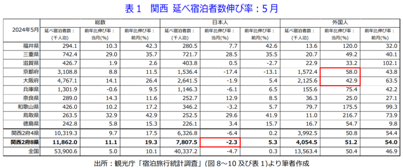 ▶観光庁によれば、5 月の関西 2 府 8 県の延べ宿泊者数(全体)は11,862.0千人泊であった(表1)。前年同月比では+11.1%と増加幅は前月(同+19.3%)から幾分縮小した。