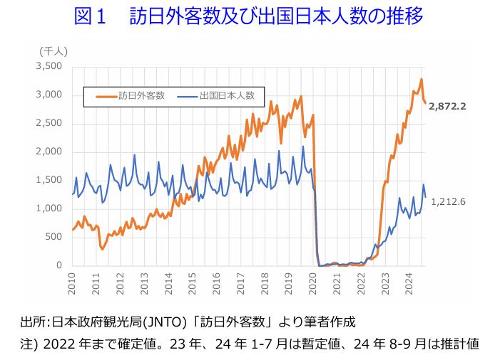 ▶JNTO訪日外客統計によれば(図1及び表4)、9月の訪日外客総数(推計値)は287万2,200人となり、同月の過去最高値を更新した(前年同月比+31.5%)。また、出国日本人数は121万2,600人となり、3カ月連続で100万人超の水準となった(同+20.7%)。ただし、19年同月比でみれば-30.8%と、依然コロナ禍前の水準を下回っている。結果、7-9月期の訪日外客数は909万7,802人となり(前年同期比+36.6%)、2四半期連続で900万人超の水準となった(4-6月期:922万3,939人)。また、出国日本人数は369万8,550人であった(同+19.4%)。夏季休暇による海外旅行需要増加の影響もあり、2四半期ぶりに300万人超の水準となった(4-6月期:276万704人)。