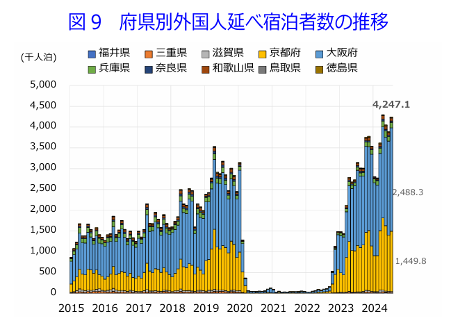 ▶外国人延べ宿泊者数は4,247.1千人泊となった(表1及び図9)。前年同月比+34.8%と7カ月連続で2桁の伸びが続いており、好調を維持している(前月:同+51.2%)。府県別に延べ宿泊者数を降順にみれば、大阪府2,488.3千人泊、京都府1,449.8千人泊、兵庫県129.9千人泊、和歌山県68.5千人泊、奈良県33.5千人泊、滋賀県22.0千人泊、三重県19.1千人泊、徳島県17.0千人泊、鳥取県13.7千人泊、福井県5.5千人泊であった。なお、大阪府の延べ宿泊者数は過去最高値を更新した。前年同月比をみれば、大阪府(同+37.8%)や京都府(同+29.8%)が大幅に伸び、全体の増加に寄与した。