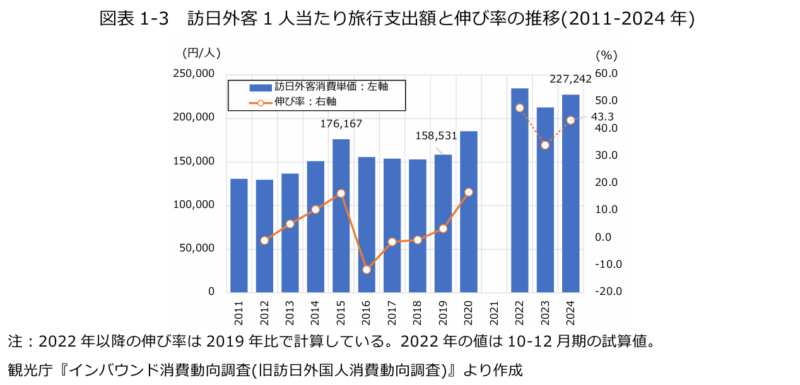 消費単価をみれば、足下の2024年は22.7万円、19年比+43.3%増加した。訪日外客数は24年にコロナ禍前のピークを上回ったが、消費単価はすでに22年に上回ったことになる。