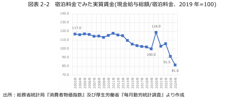 エピソード 2 で触れたように、日本人にとって宿泊料金でみた賃金(交易条件)は大きく低下しており、これが国内の観光需要の低迷の背景となっている。インバウンドのみならず国内観光も含めた観光産業が持続可能となるためにも、実質賃金の着実な引き上げ(交易条件の改善)を実現することで国内需要の回復に寄与しよう。