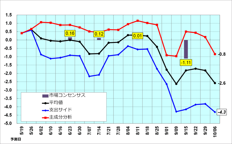 ▶最新のデータを更新の結果、CQM(支出サイド)は、7-9月期の実質GDP成長率を前期比年率-4.3%とマイナス成長を予測した。前回の予測から下方修正。また、生産サイド(主成分分析モデル)は、同-0.8%と予測。結果、両モデルの平均予測は同-2.6%と6四半期ぶりのマイナス成長の可能性が高い。市場コンセンサスは同-1.11%とともにマイナス成長を予測している。