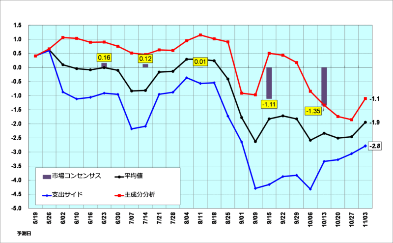 ▶最新のデータを更新の結果、CQM(支出サイド)は、7-9月期の実質GDP成長率を前期比年率-2.8%とマイナス成長を予測した。前回の予測(-3.1%)から上方修正。また、生産サイド(主成分分析モデル)は、同-1.1%と予測。結果、両モデルの平均予測は同-1.9%と6四半期ぶりのマイナス成長の可能性が高い。10月の市場コンセンサスは同-1.35%とともにマイナス成長を予測している。