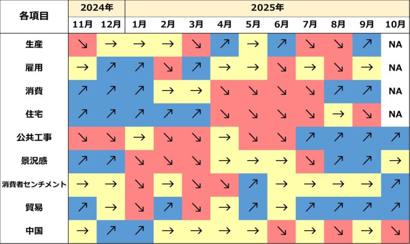 - 【生産・労働関連】9月の生産は3カ月ぶりの増産だが、7-9月期では2四半期ぶりに低下し、生産は弱い動き。9月の失業率は前月から横ばい。同月の労働力人口と就業者数はともに減少し、7-9月平均では、いずれも3四半期ぶりの減少。8月の実質現金給与総額は4カ月ぶりの減少となった。