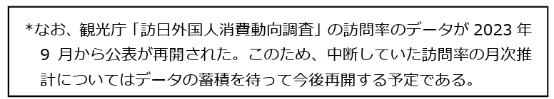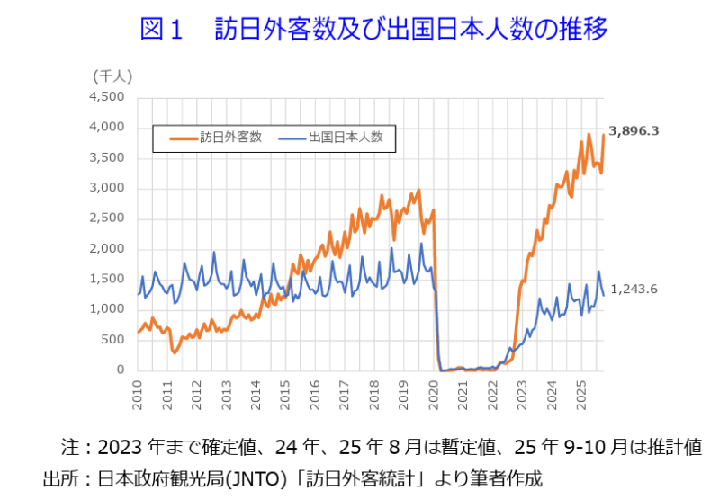 ▶JNTO訪日外客統計によれば(図1及び表4)、10月の訪日外客総数(推計値)は389万6,300人であった。中国の国慶節に伴う大型連休などの影響もあり、前年同月比+17.6%、6-7月の1桁台から3カ月連続で2桁台の伸びとなった。また、同月の出国日本人数は124万3,600人であった(同+8.3%)。なお、2019年同月比では-25.2%と減少幅は前月の同-20.4%から拡大し、アウトバウンド需要は依然低迷している。