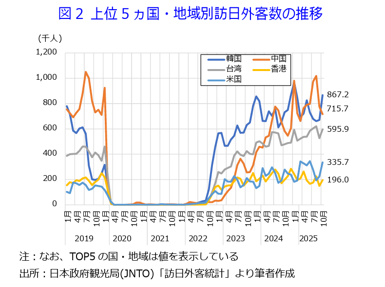 ▶訪日外客数のトップ5を国・地域別にみると(図2及び表4)、10月は韓国が86万7,200人(前年同月比+18.4%)と最多であった。次いで中国が71万5,700人(同+22.8%)、台湾が59万5,900人(同+24.4%)、米国が33万5,700人(同+20.6%)、香港が19万6,000人(同-1.4%)と続く。なお、SNS等による誤情報の影響もあり香港は6カ月連続の減少だが、減少幅は前月の同-12.2%から縮小した。