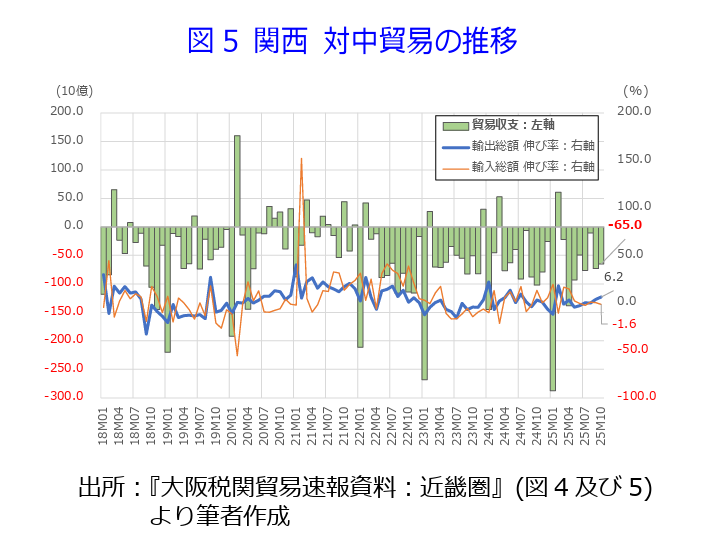 ・関西10月の輸出額は13カ月連続の増加だが、輸入額は4カ月連続の減少となった。輸出が増加を維持する一方、輸入が4カ月連続で減少したため関西の貿易収支は9カ月連続の黒字となり、黒字幅は6カ月連続で拡大した。