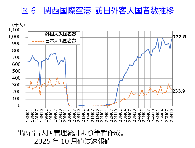▶10 月の関西国際空港(以下、関空)への訪日外客数は 97 万2,839 人であった。前年同月比+17.3%と増加幅は前月の同+13.3%から拡大。同月の日本人出国者数は23万3,884人、同+8.6%と増加幅は前月の同+18.4%から縮小した。なお、2019 年同月比では-27.6%と、減少幅は 2 カ月ぶりに拡大しており、依然コロナ禍前の水準を回復できていない。