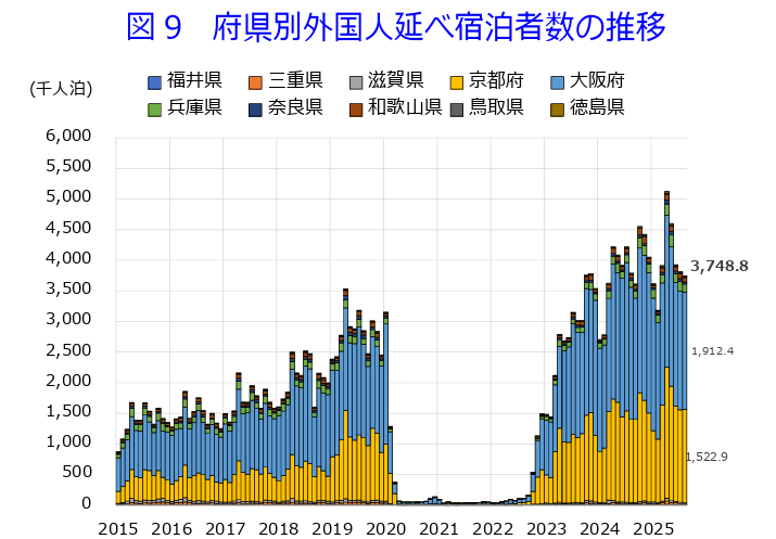 ▶外国人延べ宿泊者数は3,748.8千人泊であった(表1及び図9)。前年同月比-1.0%と2カ月連続の減少だが、減少幅は前月の同9.5%から縮小した。府県別に延べ宿泊者数を降順にみれば、大阪府1,912.4千人泊、京都府1,522.9千人泊と2府に集中している。次いで、兵庫県130.4千人泊、和歌山県73.5千人泊、奈良県33.8千人泊、三重県23.4千人泊、滋賀県17.1千人泊、鳥取県15.5千人泊、徳島県14.3千人泊、福井県5.6千人泊であった。前年同月比(-1.0%)への寄与度をみれば、大阪府(同-6.5%ポイント)、滋賀県(同-0.0%ポイント)、奈良県(同-0.0%ポイント)、3府県が外国人延べ宿泊者の減少に寄与した。