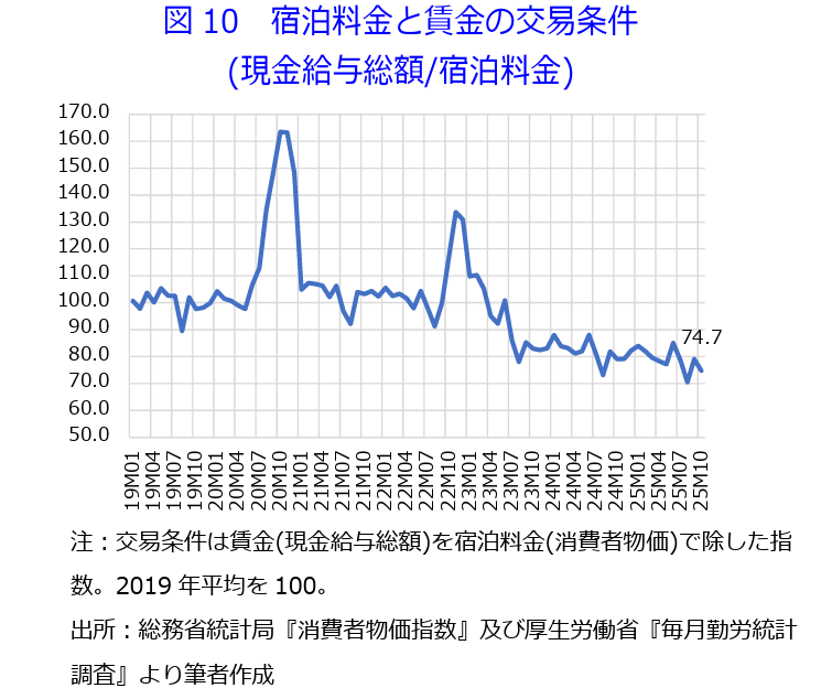 ▶なお、宿泊料金と賃金との交易条件(現金給与総額/宿泊料金:2019年=100)をみれば、2025年10月は74.7となった。前年同月比-5.4%と31カ月連続で悪化した。宿泊料金の高止まりが続いている中、依然として日本人宿泊者にとっては厳しい状況が続いている(図10)。