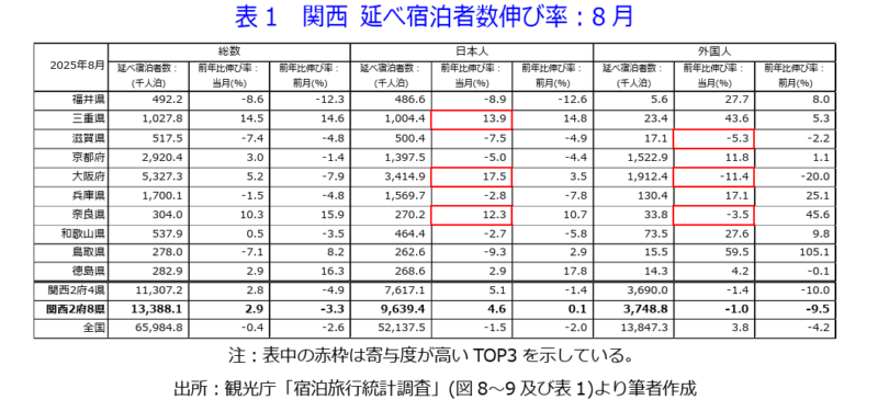 ▶観光庁によれば、8月の関西2府8県の延べ宿泊者数(全体)は13,388.1千人泊(表1)。前年同月比+2.9%と2カ月ぶりに増加した(前月:同-3.3%)。大阪・関西万博の影響もあり、日本人宿泊者が増加に寄与した。