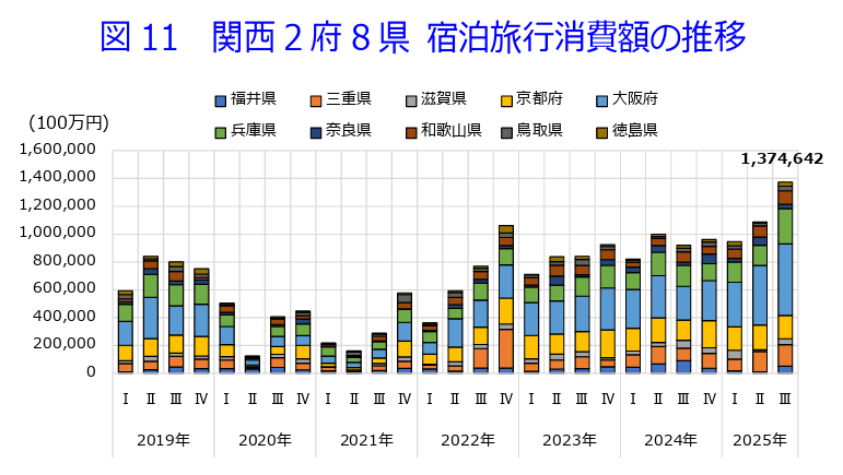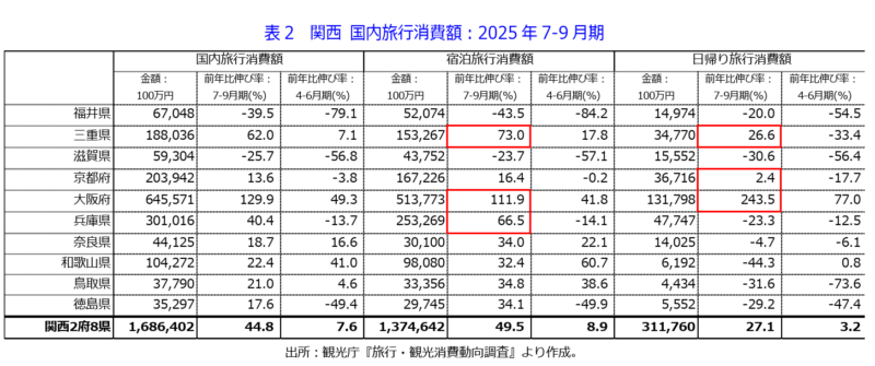 ・2025年7-9月期関西(2府8県ベース)の国内旅行消費額(速報)は1兆6,864億円となり過去最高値を更新した。伸びは7四半期連続で前年を上回り、前期から大幅拡大した。
