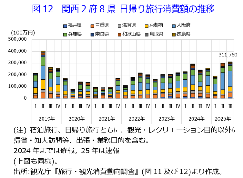 ▶国内旅行消費額のうち、7-9月期の日帰り旅行消費額は3,118億円であった。前年同期比+27.1%と2四半期連続のプラスとなった(4-6月期:同+3.2%)(図12及び表2)。府県別に消費額を降順にみれば、大阪府1,318億円(同+243.5%)、兵庫県477億円(同-23.3%)、京都府367億円(同+2.4%)、三重県348億円(同+26.6%)、滋賀県156億円(同-30.6%)、福井県150億円(同-20.0%)、奈良県140億円(同-4.7%)、和歌山県62億円(同-44.3%)、徳島県56億円(同-29.2%)、鳥取県44億円(同31.6%)であった。大阪府、三重県と京都府を除き、すべての府県で減少した。 *トピックス3は四半期ごとの掲載である。 **大阪・関西万博の影響についてはAPIR Trend Watch No.103の分析を参照