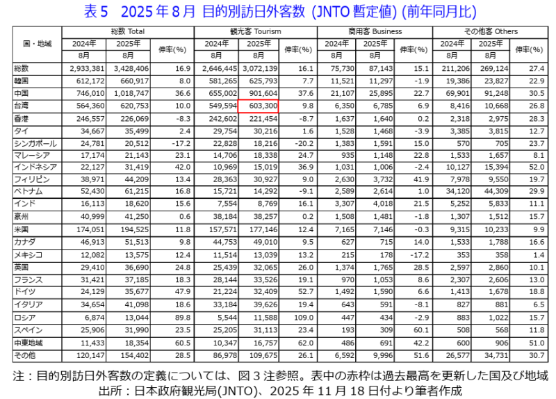 ▶目的別訪日外客総数(暫定値)をみれば(図3及び表5)、8月は342万8,406人(前年同月比+16.9%)。うち、観光客は307万2,139人(同+16.1%)、8月として過去最高値を更新した。また、その他客は26万9,124人(同+27.4%)、過去最高値を更新。大阪・関西万博の開幕で海外からの外交団が来日した影響が表れたようである。商用客は8万7,143人(同+15.1%)であった。