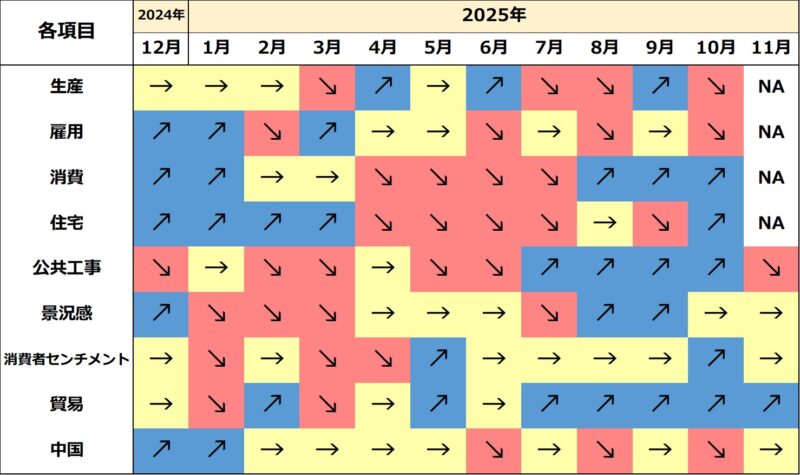 - 【景況感】11月の景気ウォッチャー現状判断DIは4カ月ぶり、先行き判断DIは2カ月ぶりにそれぞれ悪化した。日中関係の悪化により百貨店やホテルなどインバウンド関連業種が景況感の悪化に寄与した。