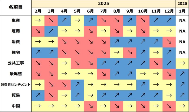 - 【景況感】1月の消費者態度指数は2カ月ぶりに改善した。同月の景気ウォッチャー現状判断DI、先行き判断DI、ともに3カ月ぶりに改善。