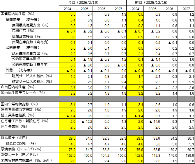 - 季節調整の掛け直しや基礎統計の改定により、過去値が遡及改定された。過去1年のうち3四半期の成長率が下方修正されたため、2026年への成長率の下駄が-0.2%低くなった。結果、2025年の実質GDPは前年比+1.1%と2年ぶりのプラス成長。ただ前年が-0.2%のマイナス成長であることから2025年はその反動の性格が強い。一方、同年の名目GDPは同+4.5%と5年連続のプラス成長となった。