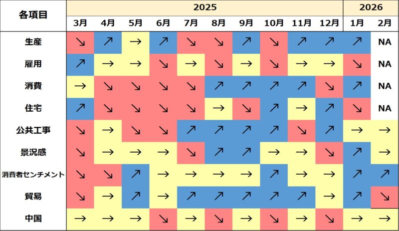 - 【生産・労働関連】1月の生産は3カ月連続で増産。結果、近畿経済産業局は生産の基調判断を10カ月ぶりに上方修正した。同月の失業率は3カ月ぶりに悪化し、労働力人口と就業者数は前月からともに減少した。12月の実質賃金は5カ月ぶりのプラスとなり、2025年通年では、前年比2年ぶりに増加した。